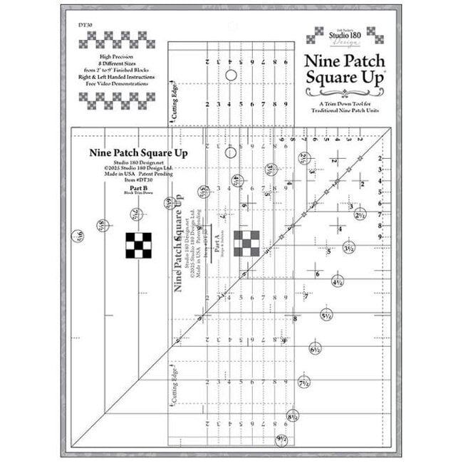 The Nine Patch Square Up™ tool is the ultimate solution to creating perfect nine patches in 8 different sizes! Like all Studio 180 Design tools and processes, our instructions build blocks slightly oversized and then quickly and easily trim them to a perfect size.