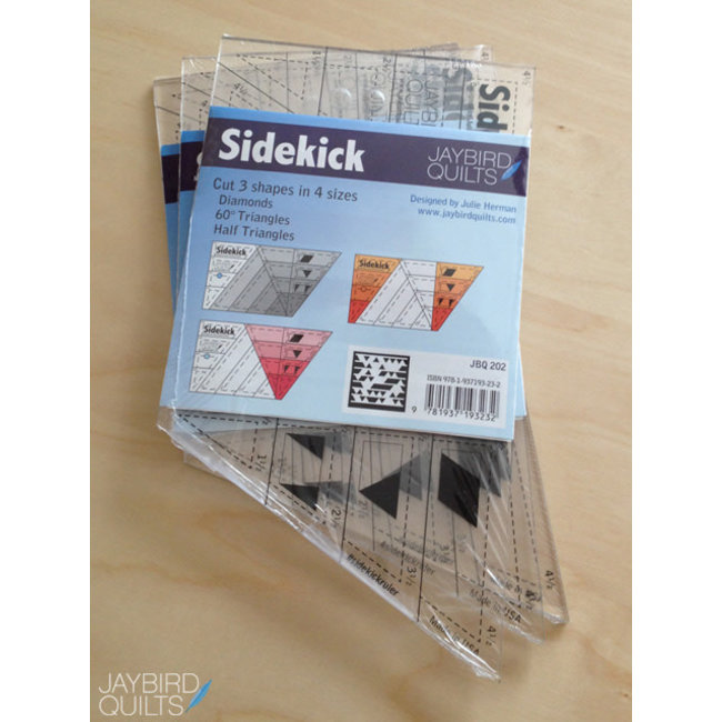 This ruler cuts diamonds, 60 degree triangles and half triangles. Cut 3 shapes in 4 sizes using the Sidekick Ruler. Each ruler comes with full color directions. The Sidekick and Hex N More rulers can work together or alone.